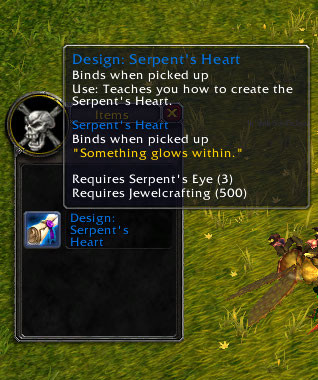 My first stop was in Valley of the Four Winds. I went for the mantid on the western edge of the zone. Based on my fuzzy head-math (aka keeping mental track of kills) I got the recipe for Serpent's Heart in about 14 kills. That's pretty decent considering the level of the mobs. Also, this recipe is still yellow at 600 skill. It might be an interesting addition to the leveling process for those who haven't capped their JC skill yet.
